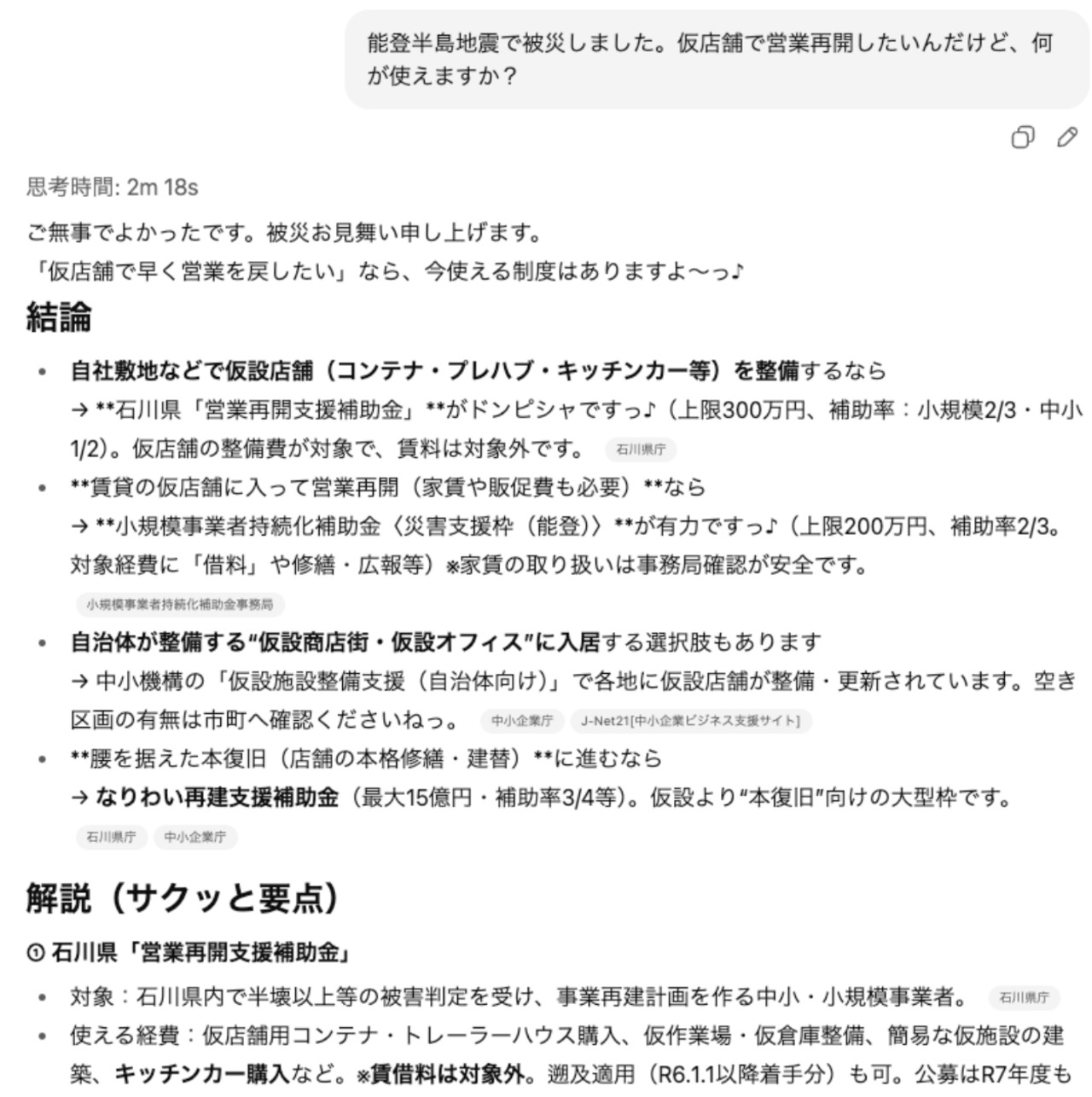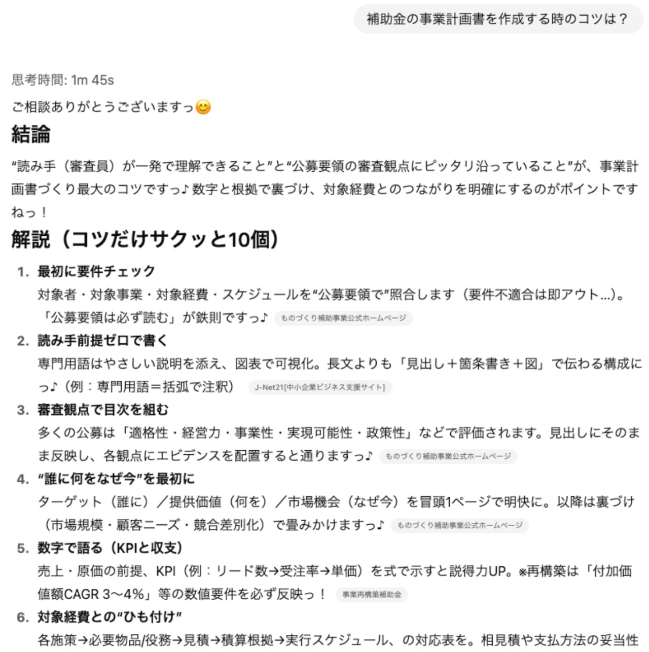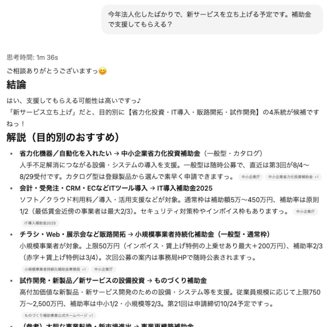 必要な情報を入力するだけで、補助金や助成金に関する的確なアドバイスを受けることができます。補助金・助成金秘書がわかりやすくサポートし、資金調達の課題を解決へと導きます!