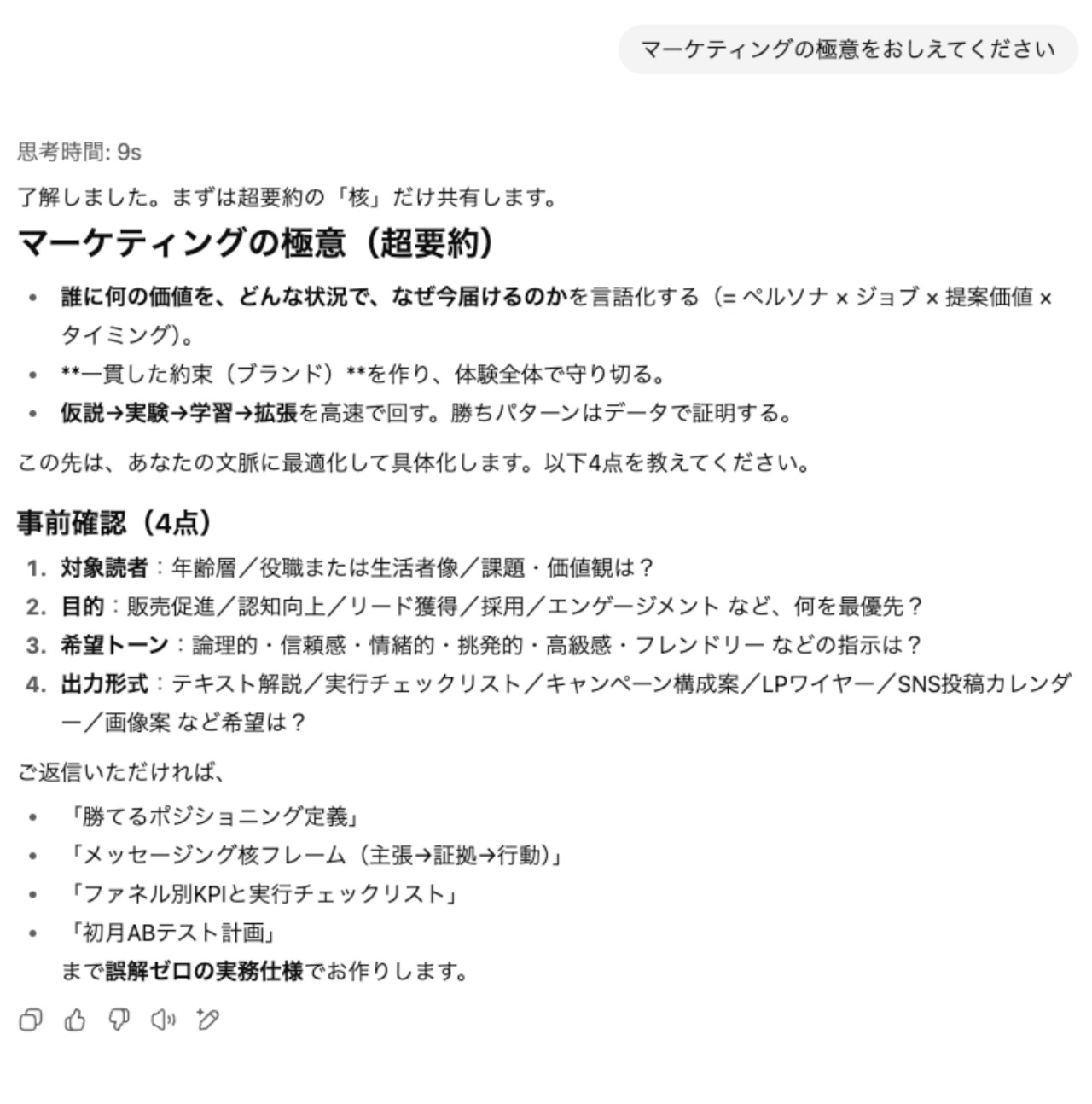 必要な情報を入力するだけで、マーケティングに関する専門的なアドバイスを受けることができます。マーケティング師匠がわかりやすくサポートし、あなたのビジネスの成長を加速させます!