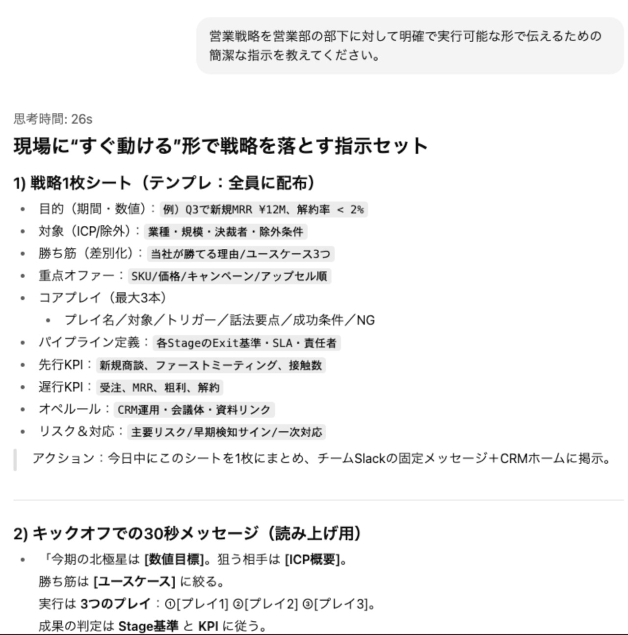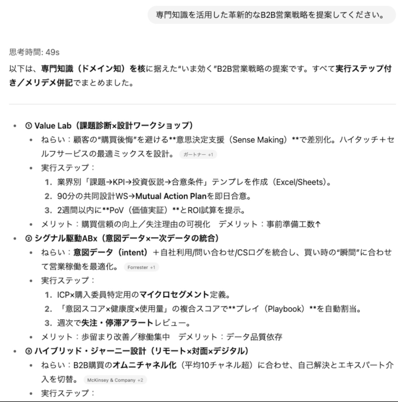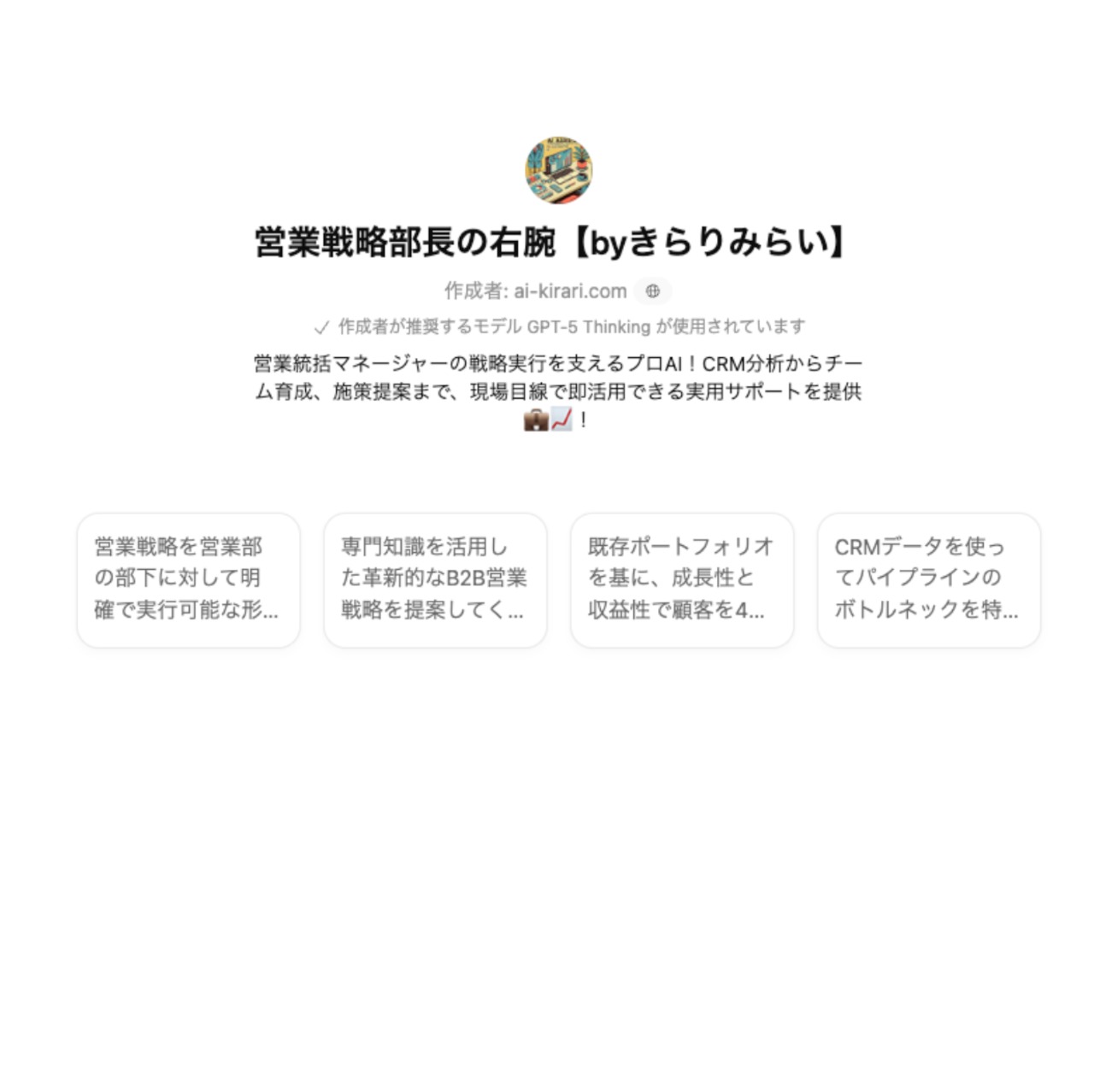 必要な情報を入力するだけで、営業に関する専門的なアドバイスを受けることができます。営業戦略部長がわかりやすくサポートし、あなたのビジネスを力強く推進します!