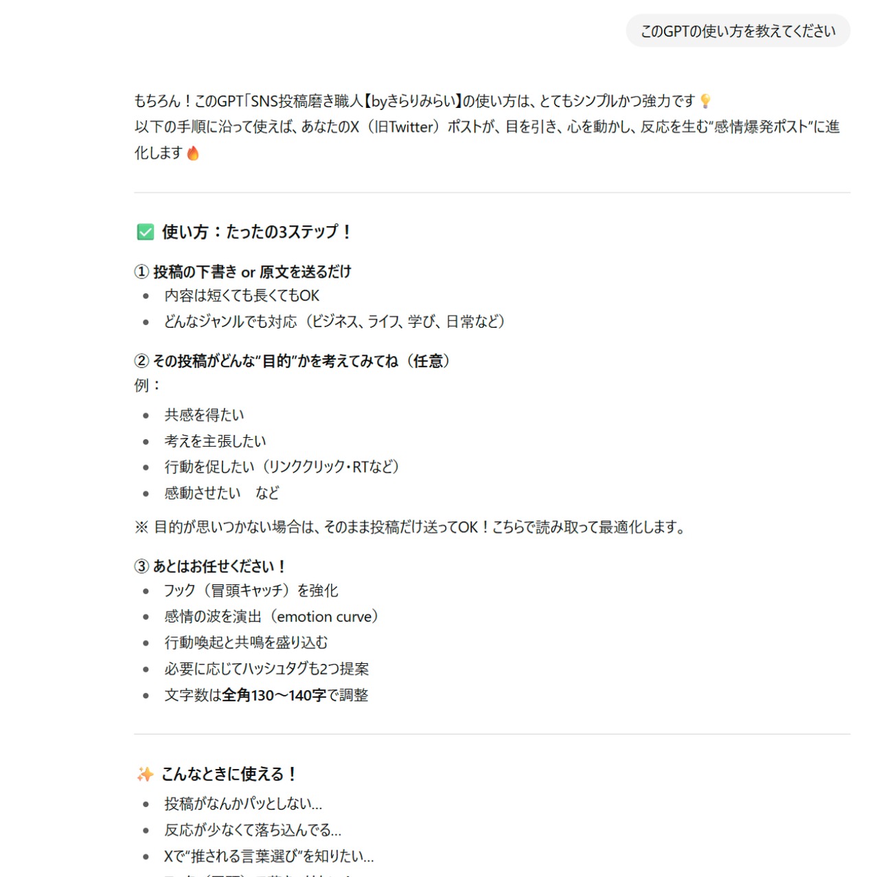 SNS投稿磨き職人【byきらりみらい】を使って、あなたのSNS投稿をさらに魅力的に仕上げませんか!X(旧Twitter)やInstagramなどSNS投稿を心震わす物語へ鍛え直す言葉磨き職人です。