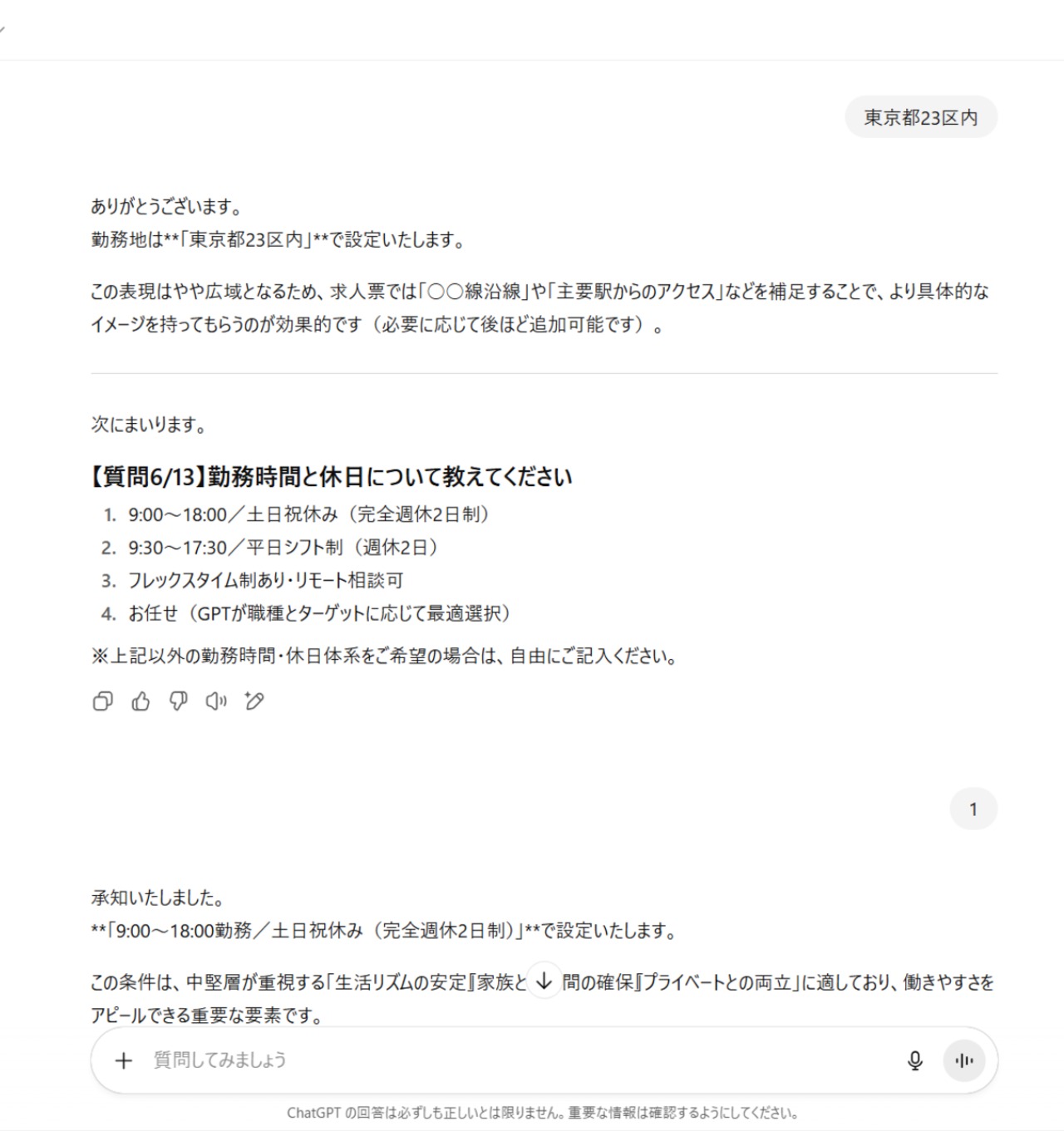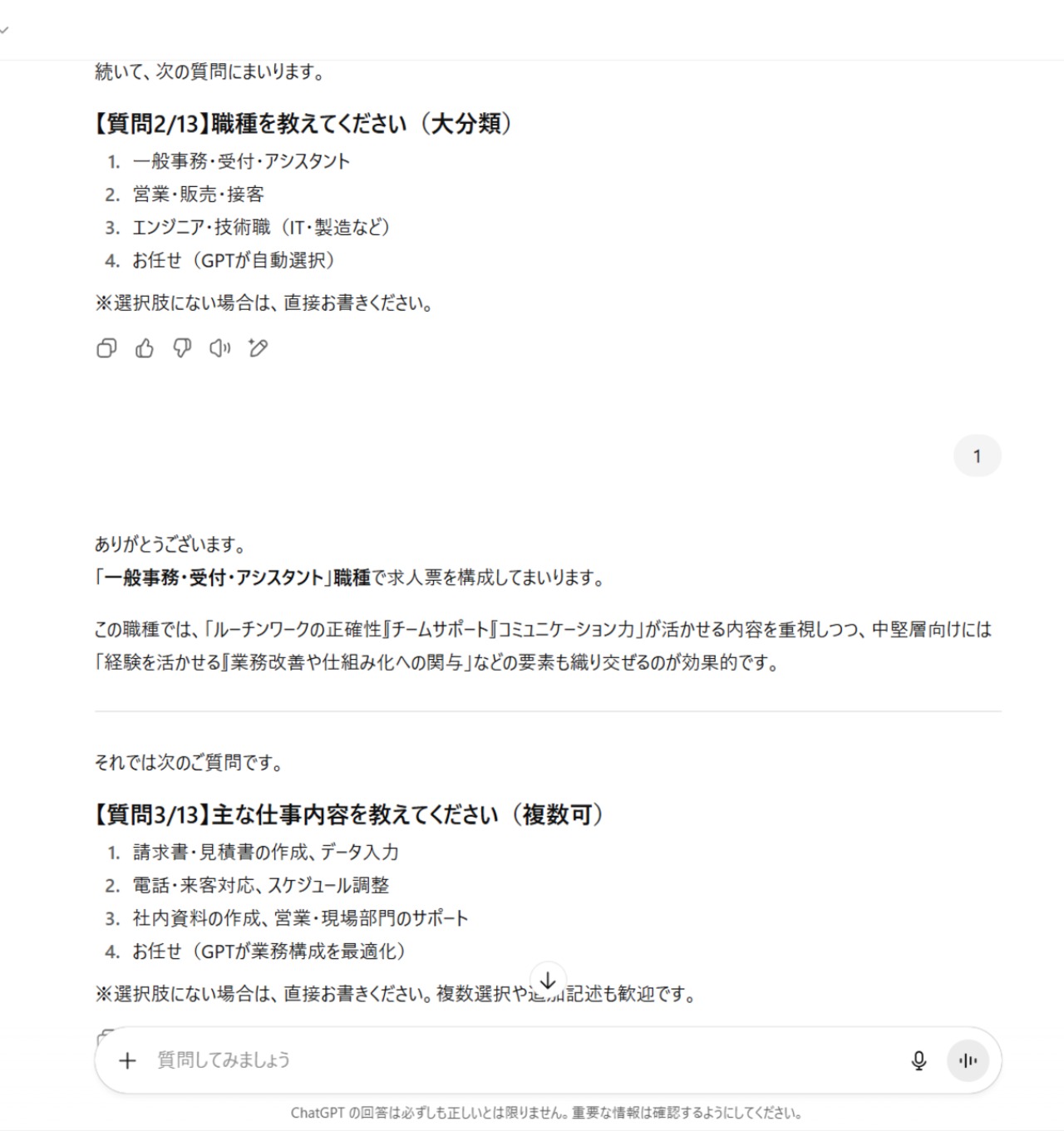 選択式で13の質問(職種や雇用形態など)に答えるだけで、魅力的な求人票が完成!会社HPや参考求人票をアップロードすると更に入力が楽になります!